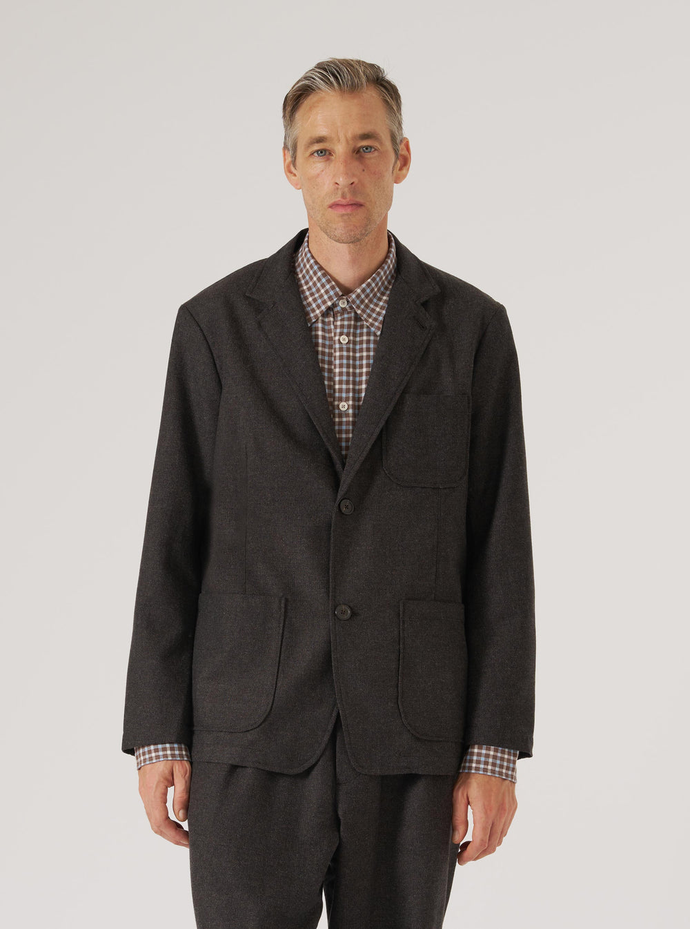 Model wears the Brown Upcycled Italian Tweed Two Button Jacket.