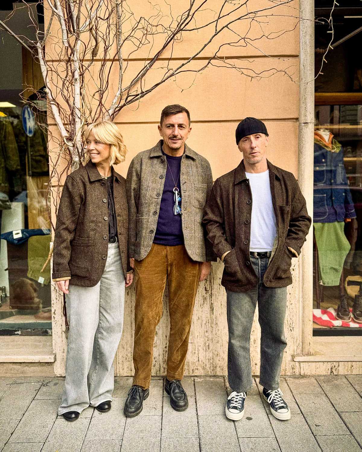 Bottiglieria were one of our very first stockists, and as a result Stefano, Laura and Renato are long-time friends of the brand. Earlier in the year, we took Renato and Stefano to visit the Harris Tweed mill on the Isle of Lewis. The trip led to the creation of a special Bakers Jacket made in three different Harris Tweeds, produced exclusively for Bottiglieria and pictured above.