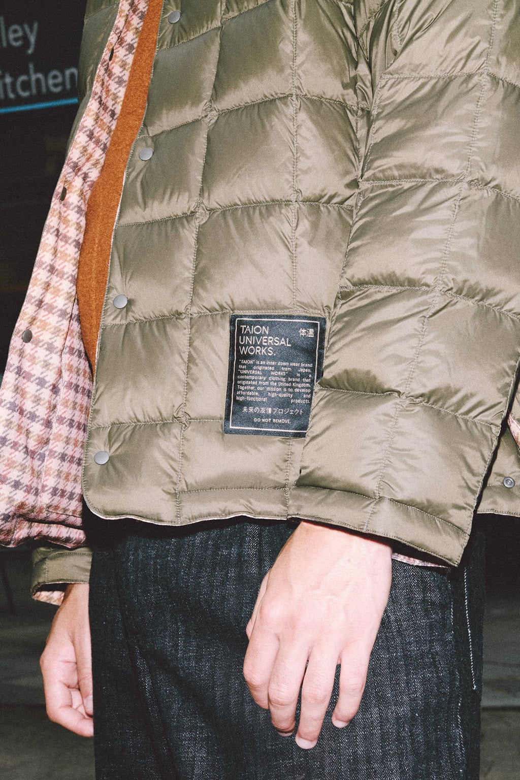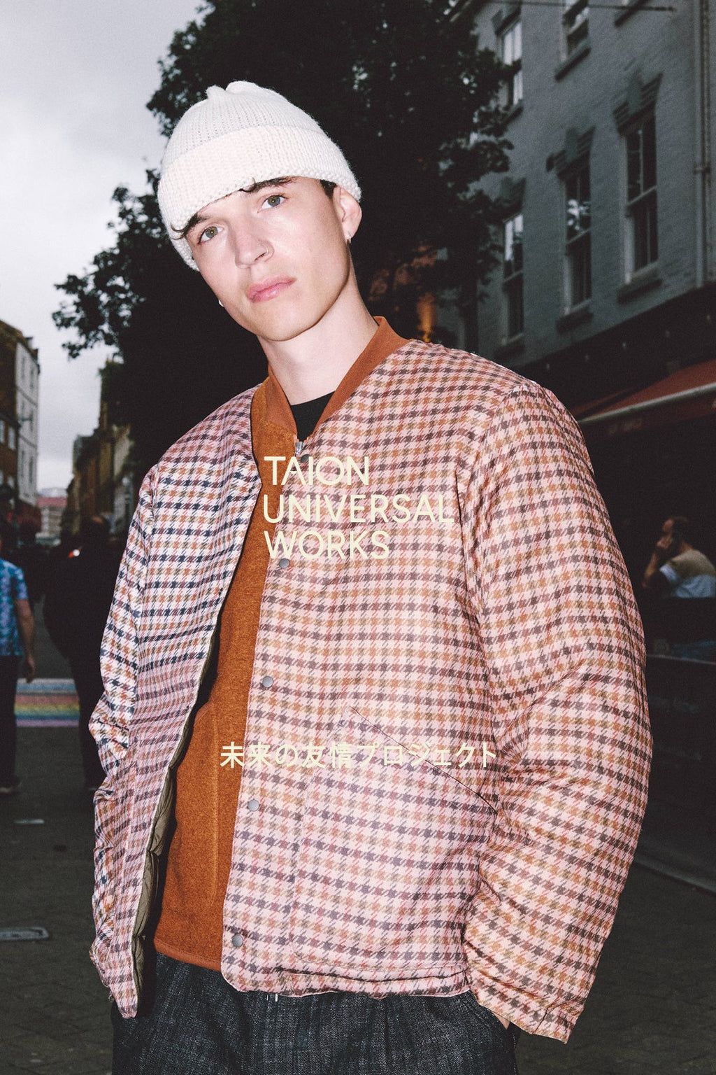 TAION (or 体温), named after the Japanese word for “body temperature”, create versatile, lightweight inner down-wear. Universal Works is a modern British clothing brand. The natural affinity between Japanese and British design formed the basis of this collaboration.This duality is reflected in each piece being reversible. A patchwork houndstooth print, evoking a tactile, traditionally wool tweed fabric, is printed onto TAION’s technical base, while the reverse is left plain.