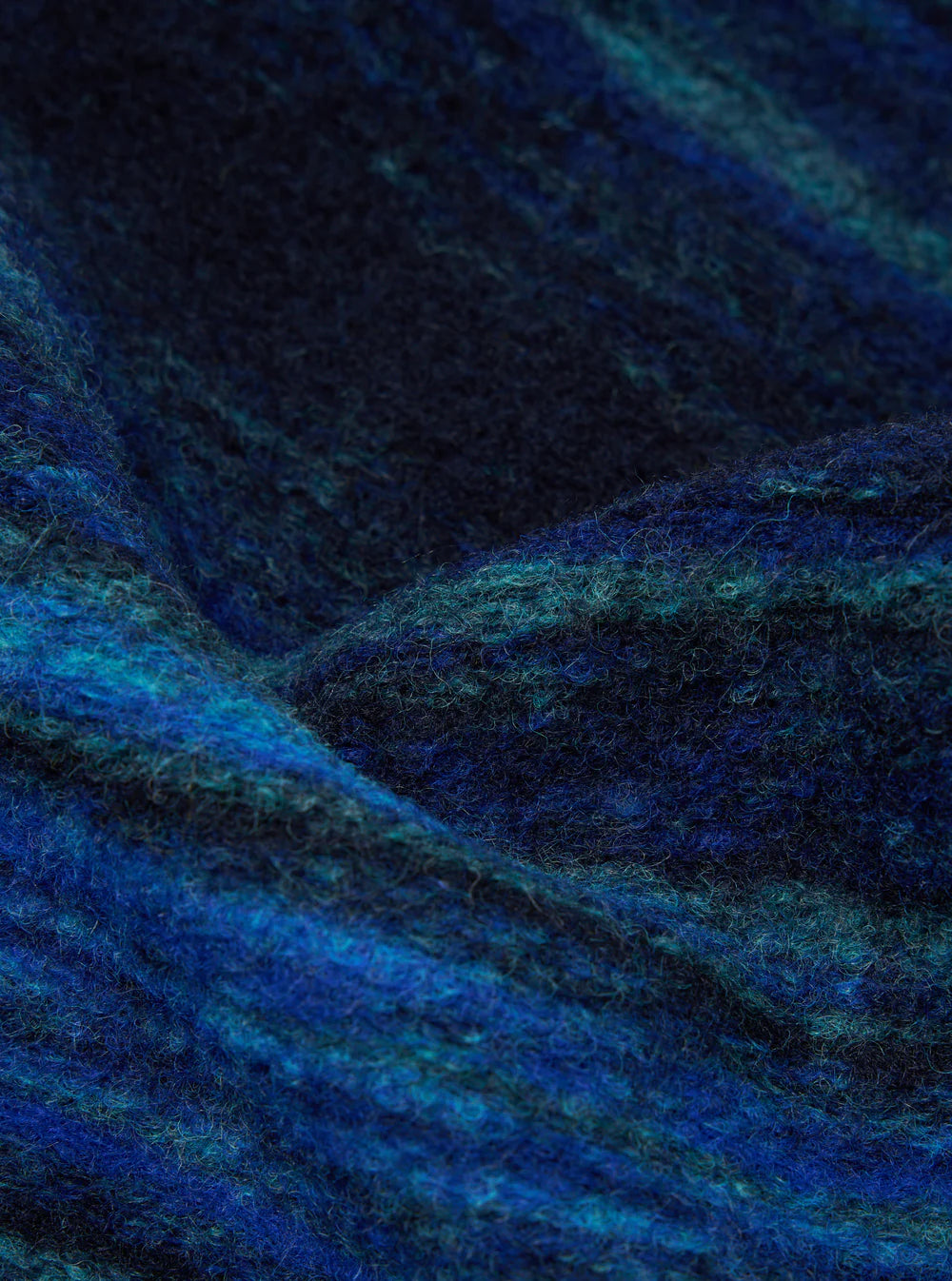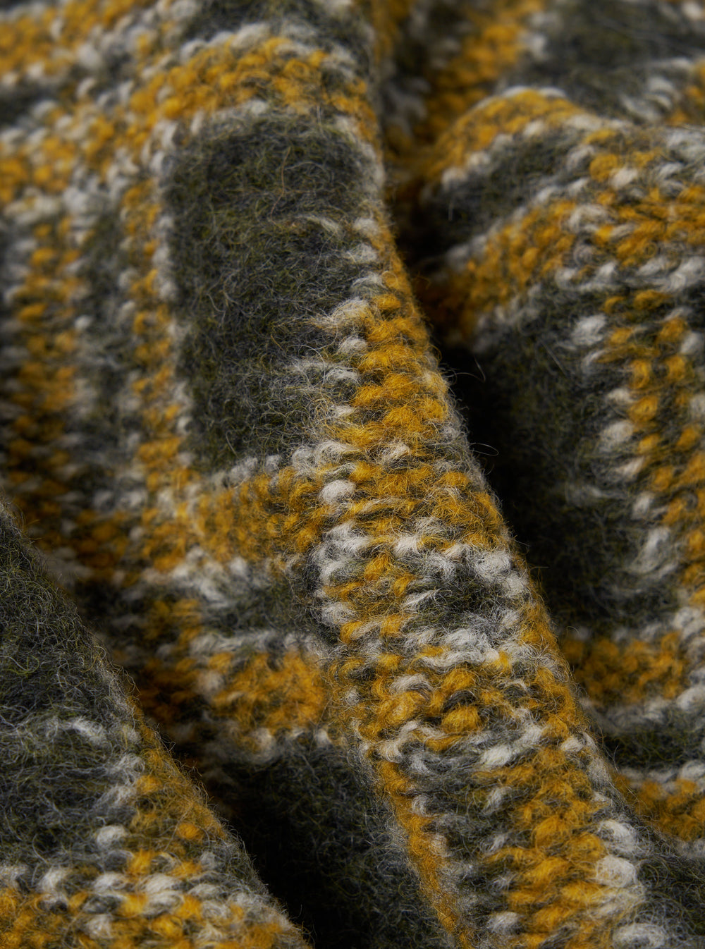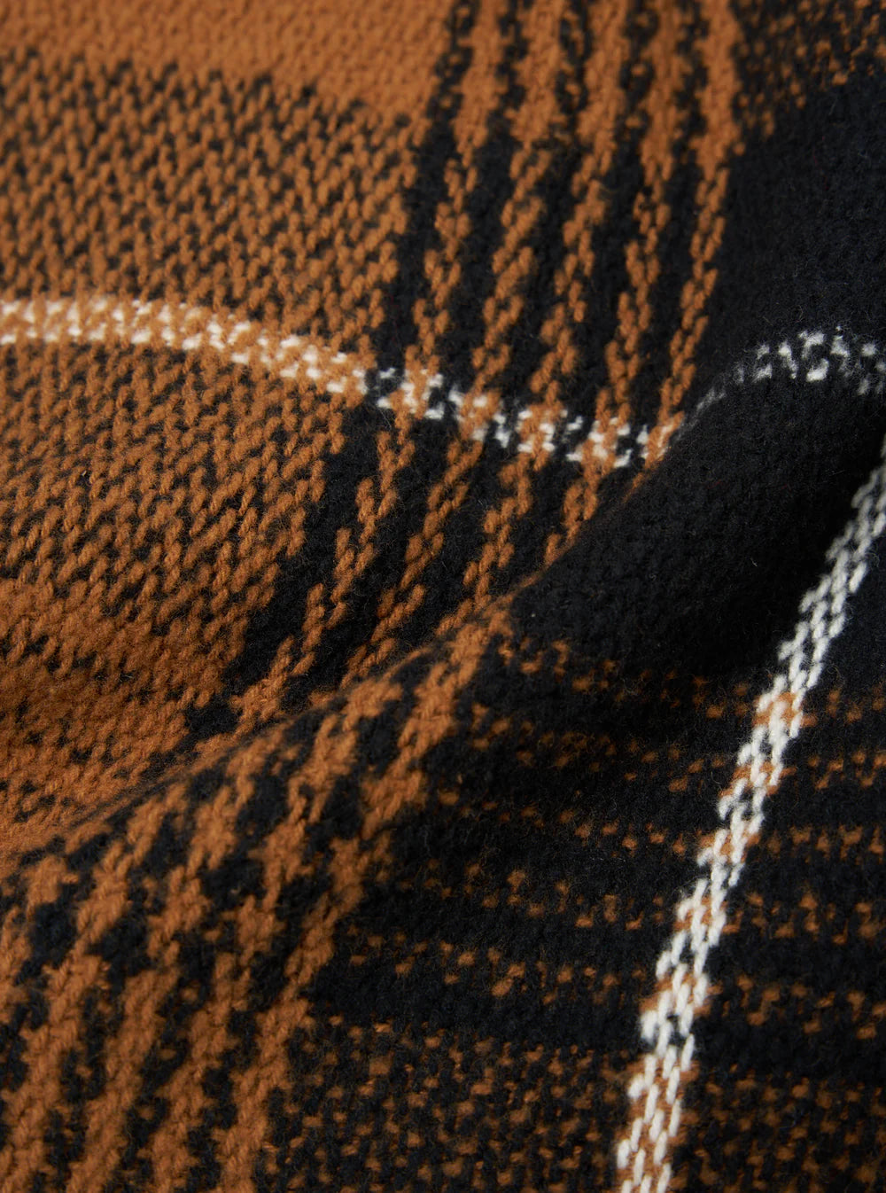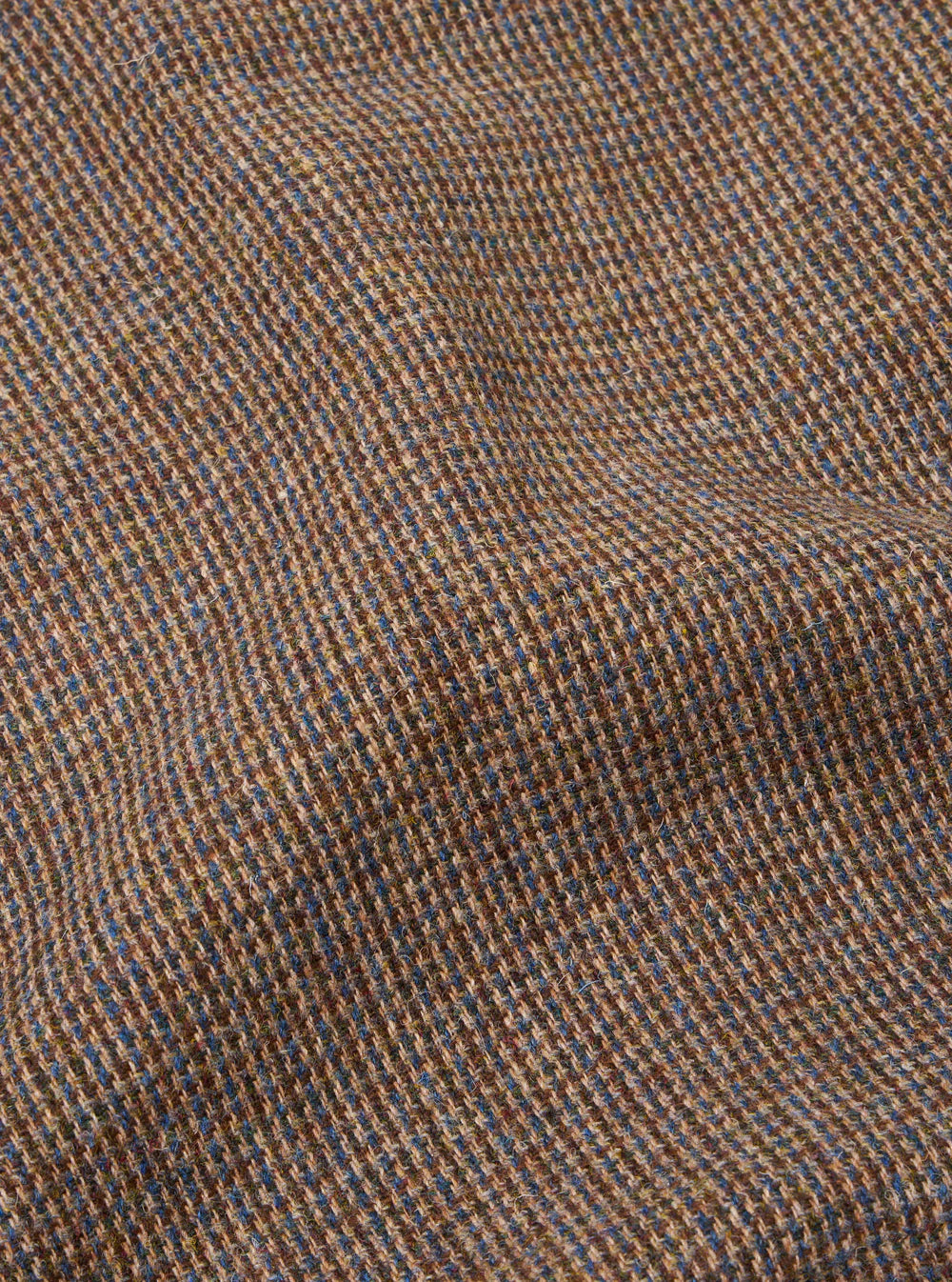 Although on a first glance, it initially appears to be a woven heavy Tweed, it is actually knitted. A wool blend fabric with a loop surface texture, brushed which softens and blends the colours of the check.