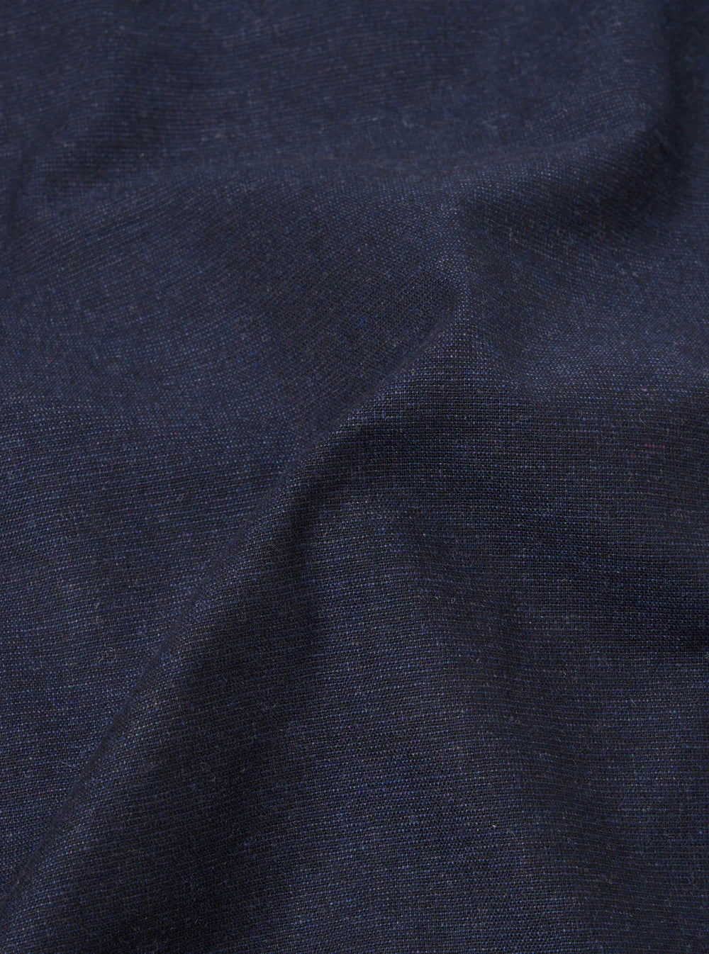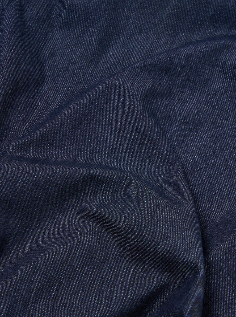 This fabric’s manufacturing process embraces a more circular approach. The uniform indigo-like colour resembles denim but is woven using the same yarn in the warp and weft which on closer inspection reveals subtle slubs and flecks.