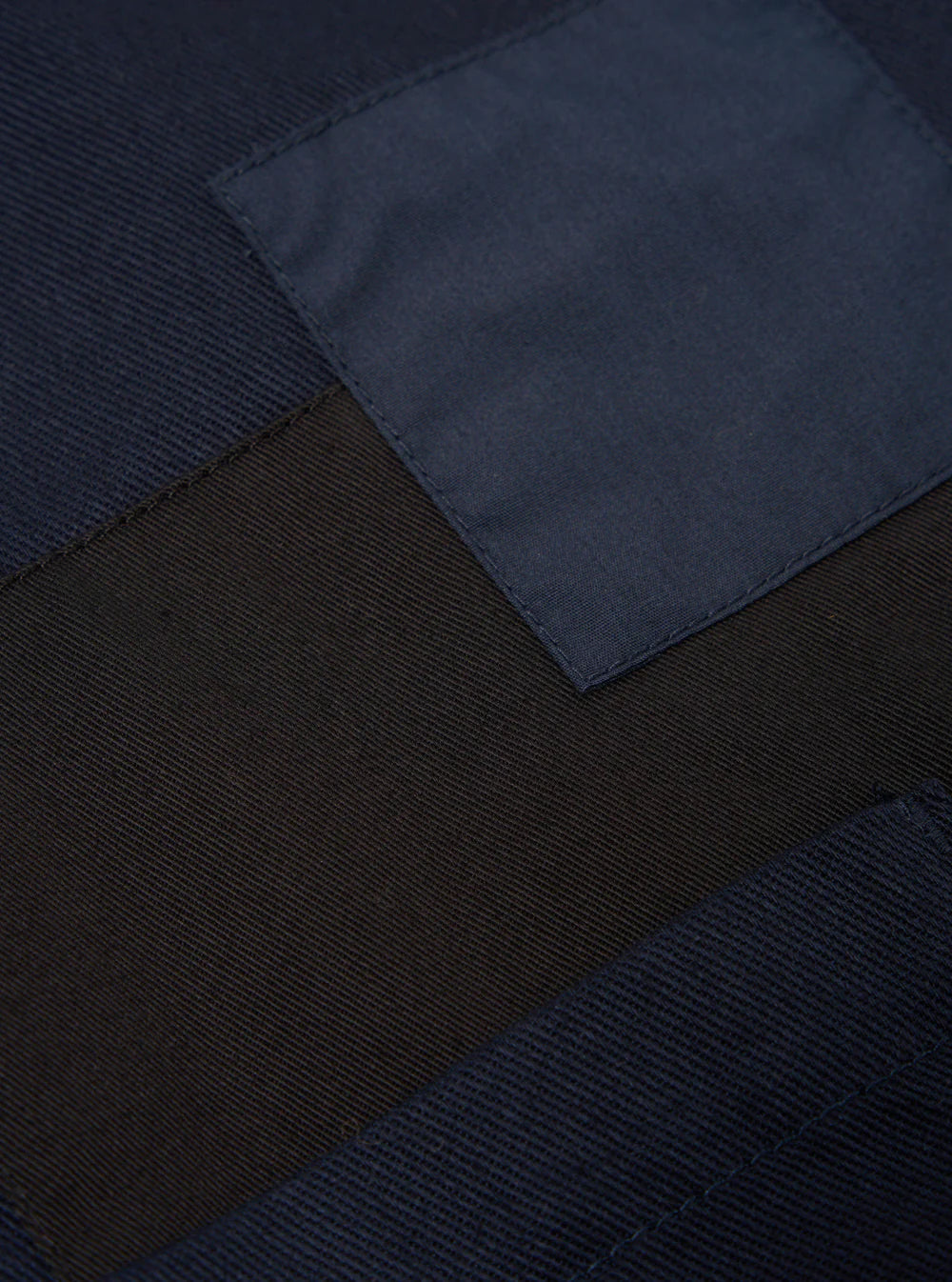 Intentionally championing the idea of patchwork mending, our patched pieces are non-repaired items, freshly made with deliberate pops of contrast cloth that promote the aesthetic of longevity. This polytech-twill mix plays with the difference in texture and tone.