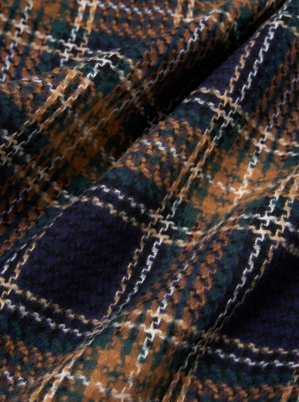 A heavyweight woven and brushed multicoloured check. A structured fabric with a woven raised texture. A structured brushed cotton with a flat and raised textural weave.
