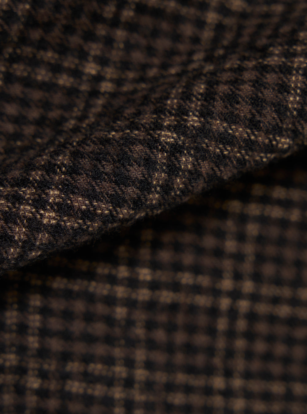 A three colour check woven with different tensions to create a slight puckering. A lightweight shirting and brushed to create softness.