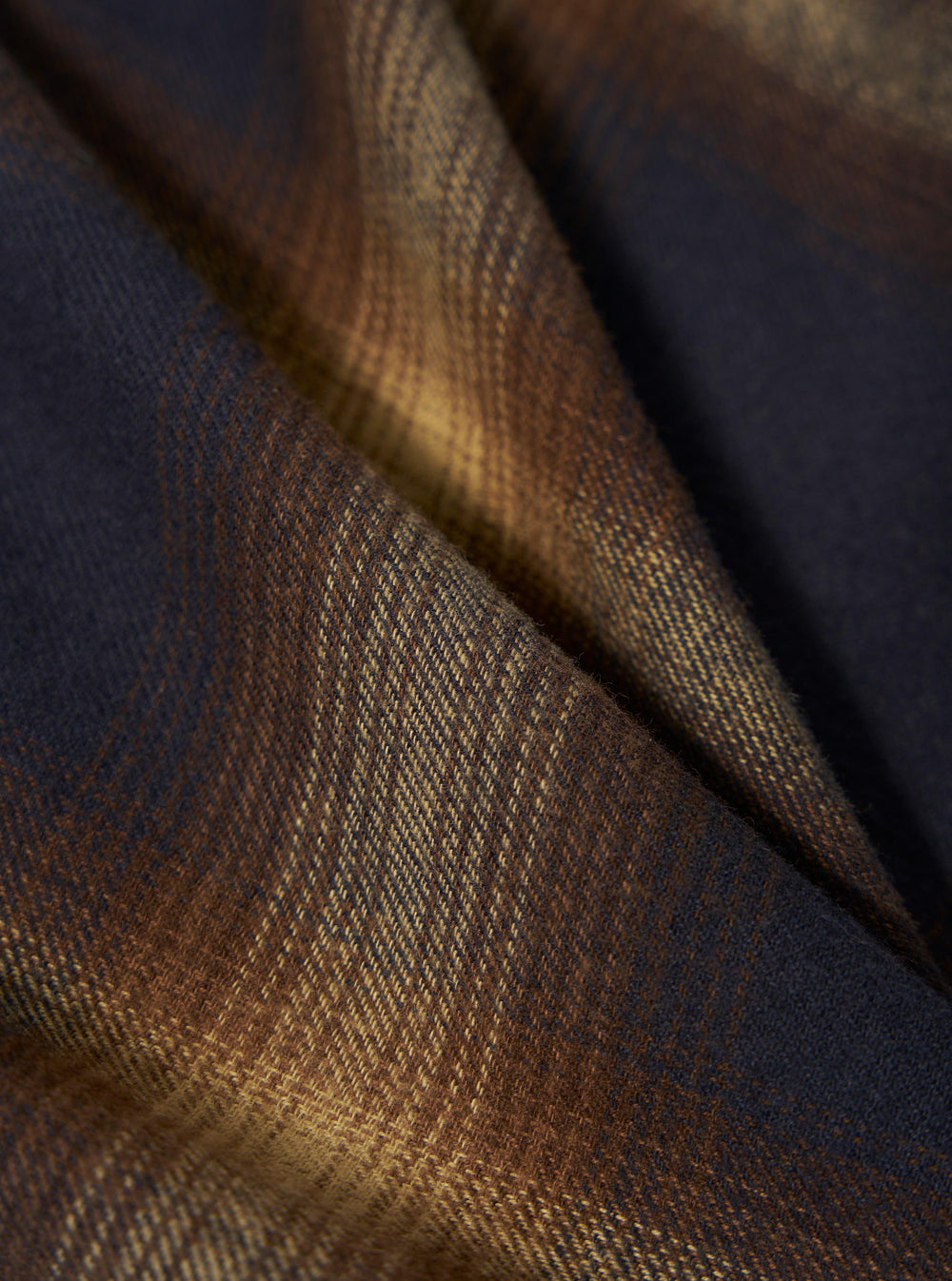 A plain weave brushed flannel. The perfect shirt weight in an earthy coloured check.