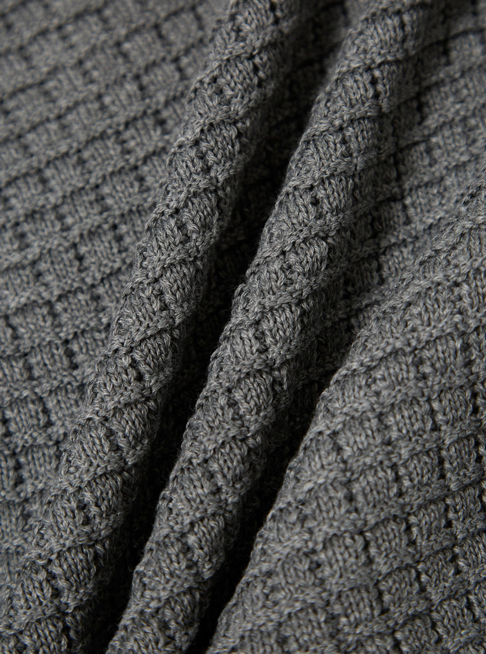 A heavily textured medium weight knit in a square waffle-like pattern in a merino blended yarn.